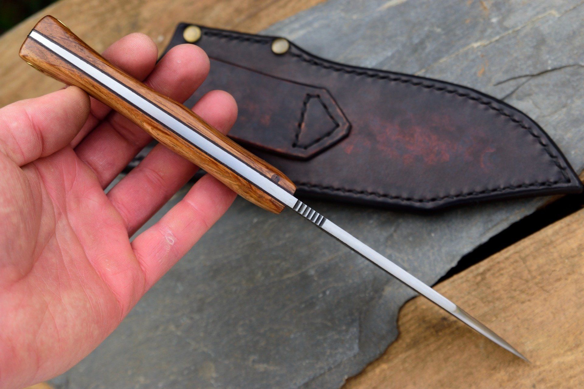 Couteau de camp 28cm, manche en bois de Chêne, Etui cuir moulé.