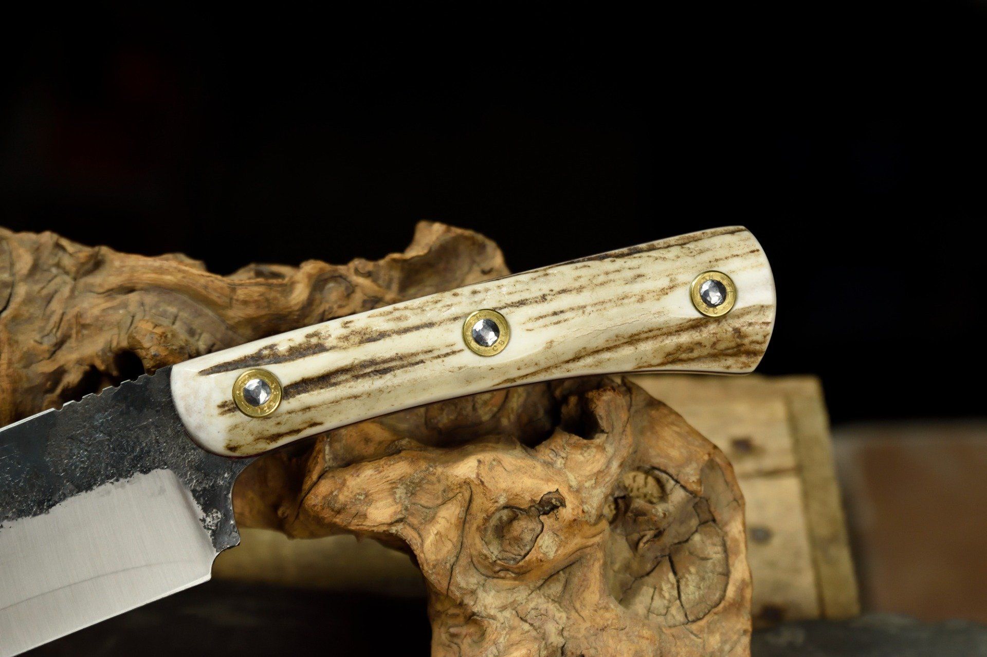 Couteau de Camp, forgé main dans un morceau de lame de ressort de camion, manche en Bois de Cerf avec intercalaires cuir.