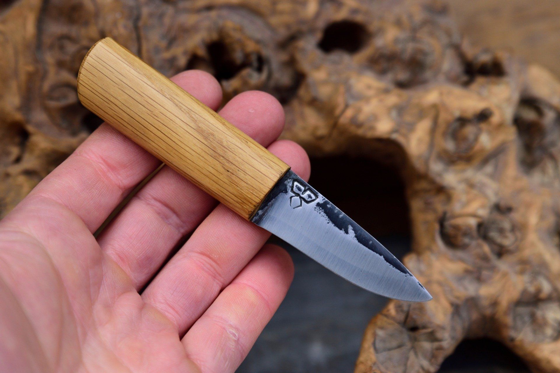 Couteau utilitaire 13.8cm, Lame de 6.2cm forgée dans un ressort de voiture. Trempe sélective à l'eau du tranchant. Manche en Chêne. 32g