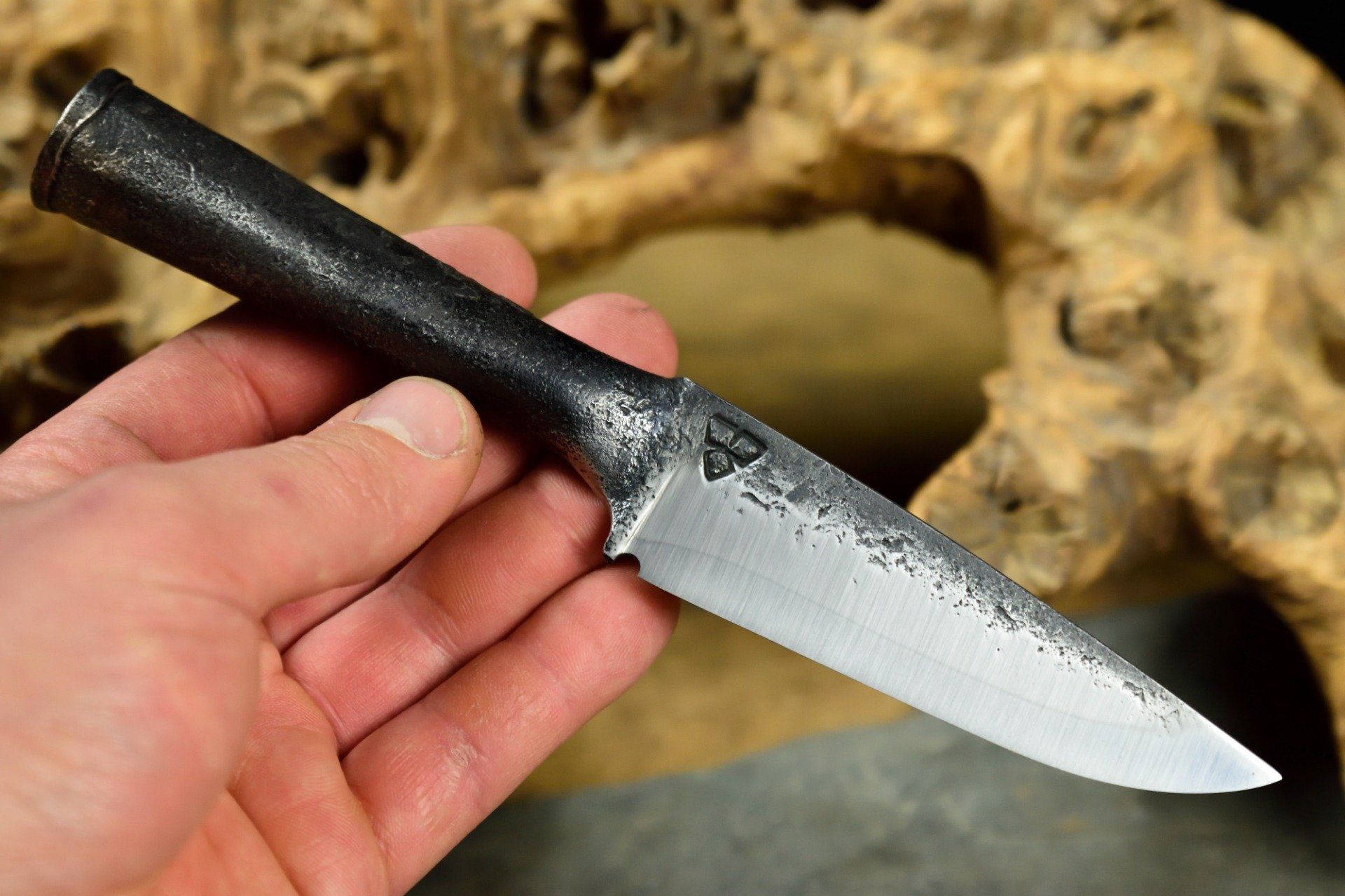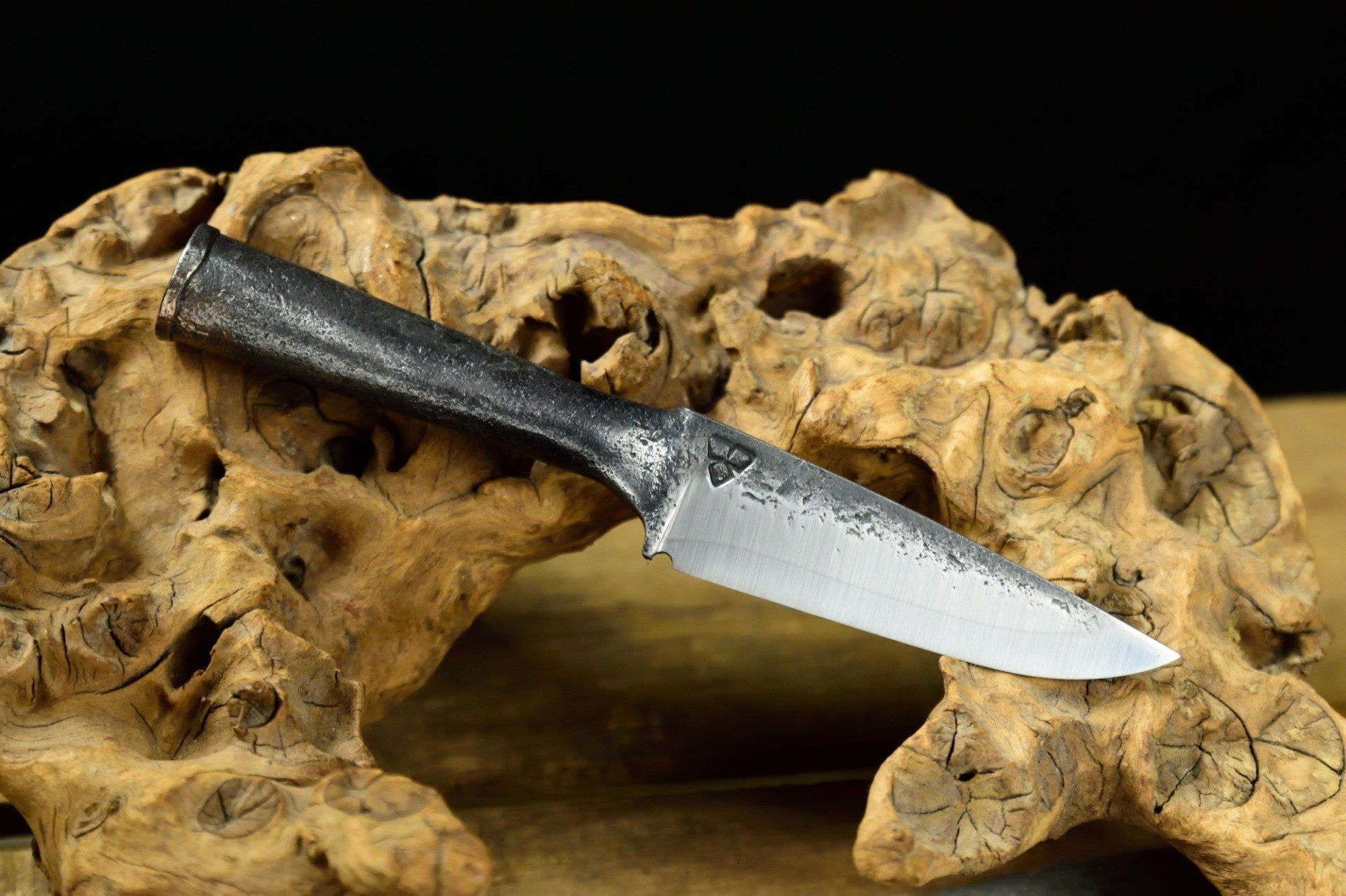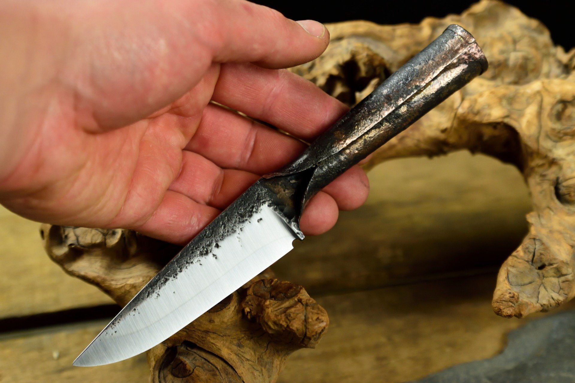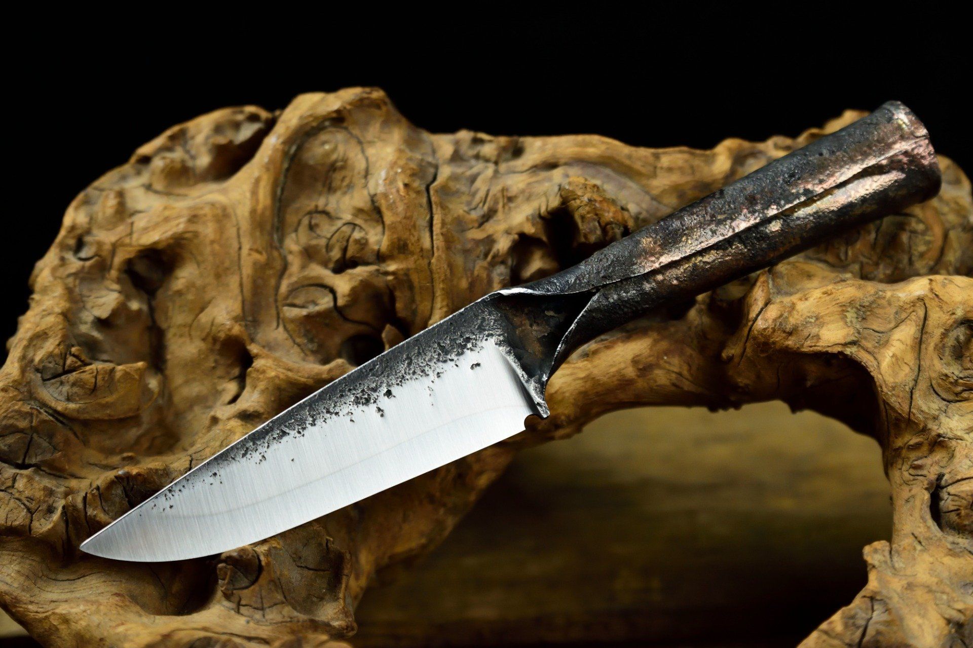 Couteau Utilitaire forgé dans un morceau de lame de ressort, Brasure au cuivre sur la jonction du manche roulé, 20.8 cm de longueur pour 10 cm de tranchant trempé à l'eau, 30 mm de hauteur de lame, 3.2 mm d'épaisseur, 90 g