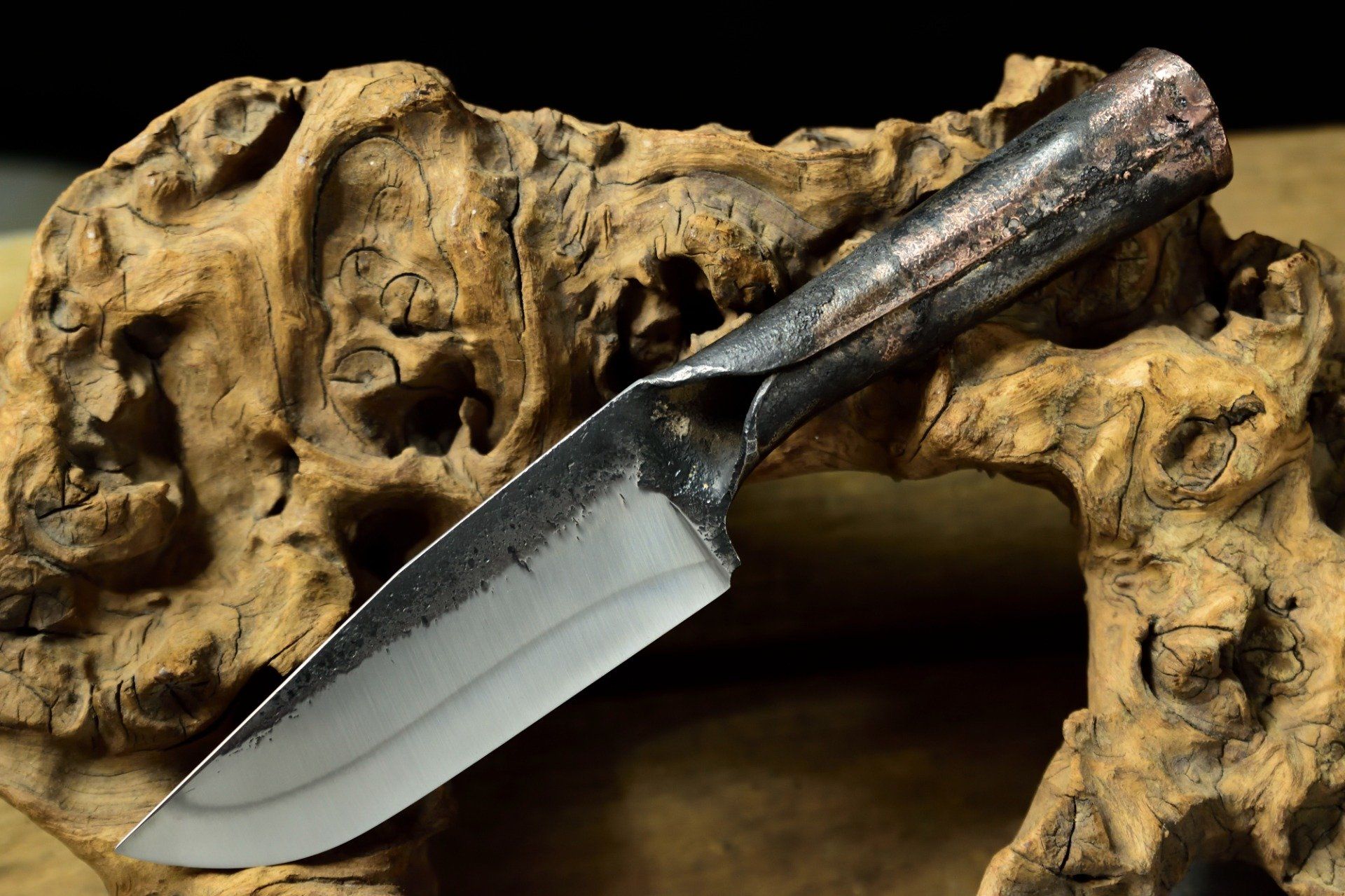 Couteau utilitaire forgé dans un morceau de lame de ressort, Brasure au cuivre sur la jonction du manche roulé, 23.2 cm de longueur pour 11.5 cm de tranchant trempé à l'eau, 39 mm de hauteur de lame, 4 mm d'épaisseur, 146 g